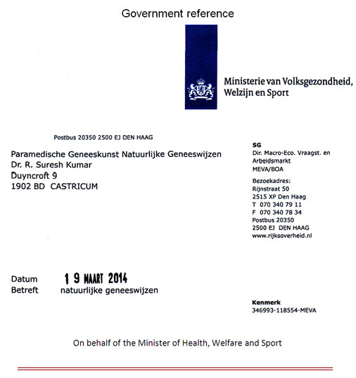 In 2013 I updated my achievements to the Ministry of Health (VWS) with a few hundreds of pages of relevant documents related to treat incurable diseases successfully. I also underlined the importance of "Nature Care Medicine" for chronically ill patients. The Minister appreciated my effort and clearly noticed that I am very motivated to work in this field of medicine to keep one another healthy as possible. On behalf of the Honorable Minister the Director of Health MEVA-VWS duly acknowledged the statement for this concern on 19th March 2014.